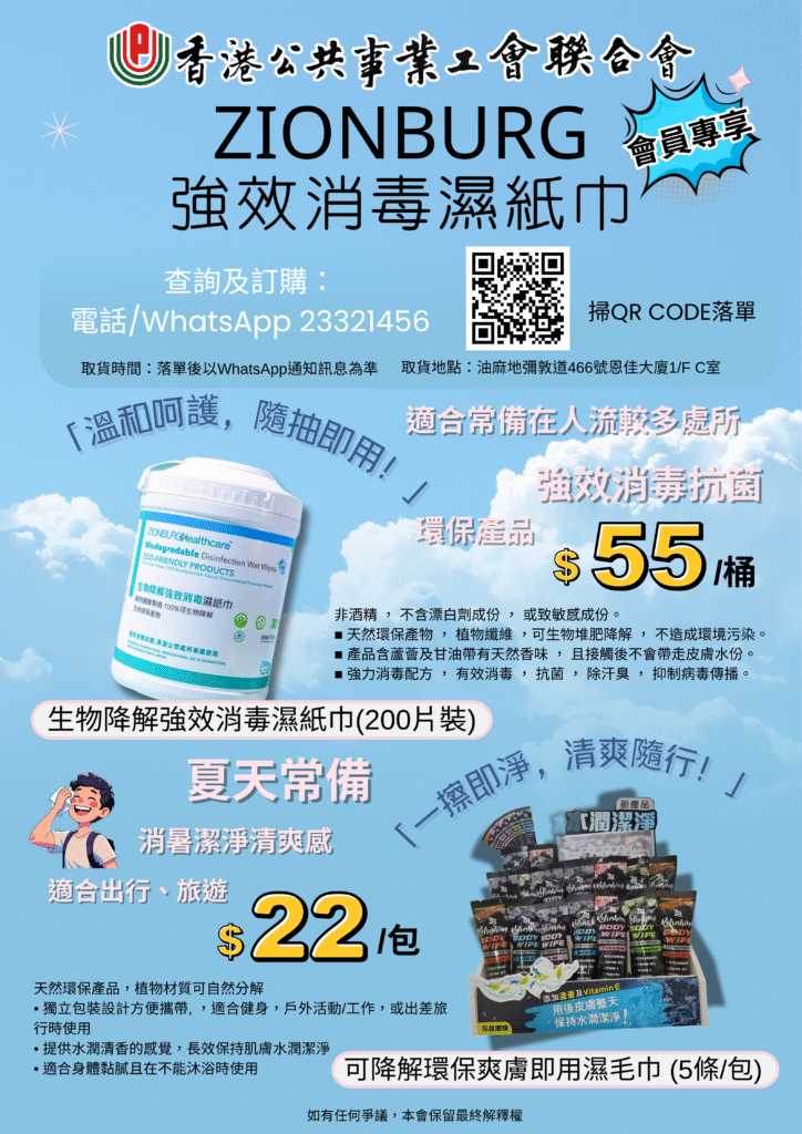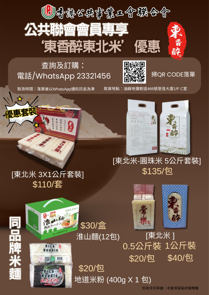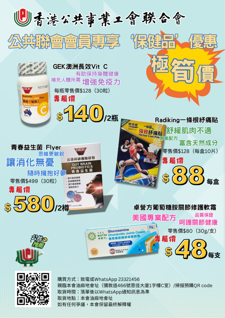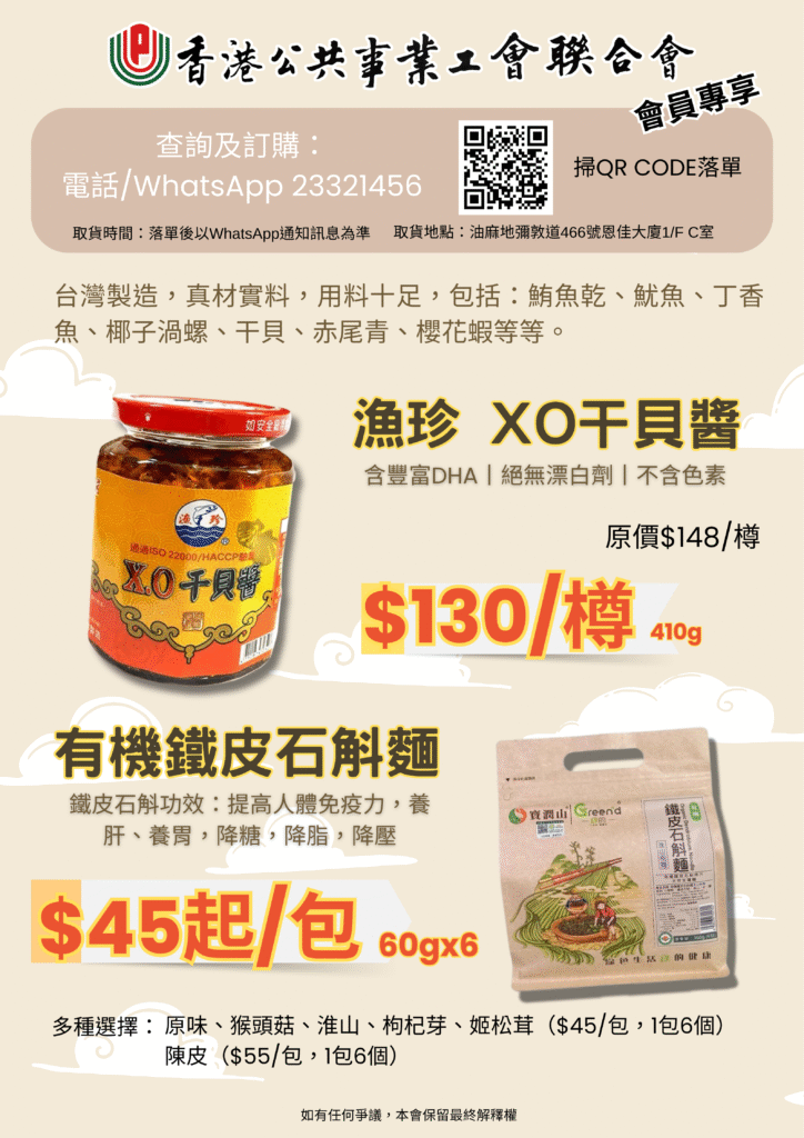 商店 香港公共事業工會聯合會所售賣的優惠商品, 歡迎 whatsapp 23321456 購買 : 消委會 5 星級蚊怕水 “RID” 請按此進入 whatsapp 23321456 查詢/購買 “漁珍” XO 干貝醬 有機鐵皮石斛麵 請按此進入 whatsapp 23321456 查詢/購買 “東香醉” 東北米 請按此進入 whatsapp 23321456 查詢/購買 “保健品” 優惠 請按此進入 whatsapp 23321456 查詢/購買 強效消毒濕紙巾(ZIONBURG) 請按此進入 whatsapp 23321456 查詢/購買 分享此文: 分享到 Facebook(在新視窗中開啟) Facebook 分享到 X(在新視窗中開啟) X